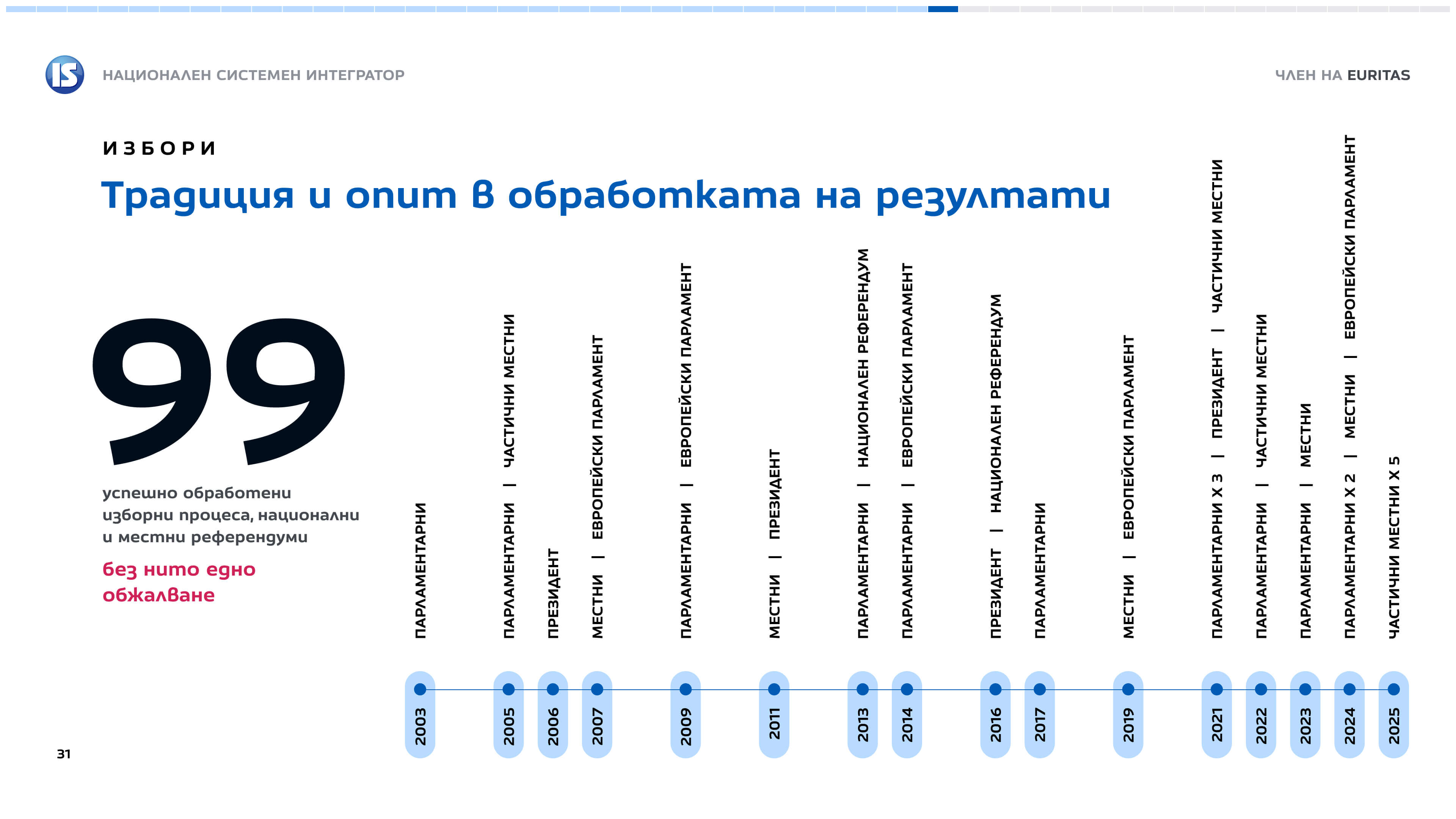 До този момент Информационно обслужване е обработило компютърно резултатите от общо 99 проведени избори и национални референдуми.